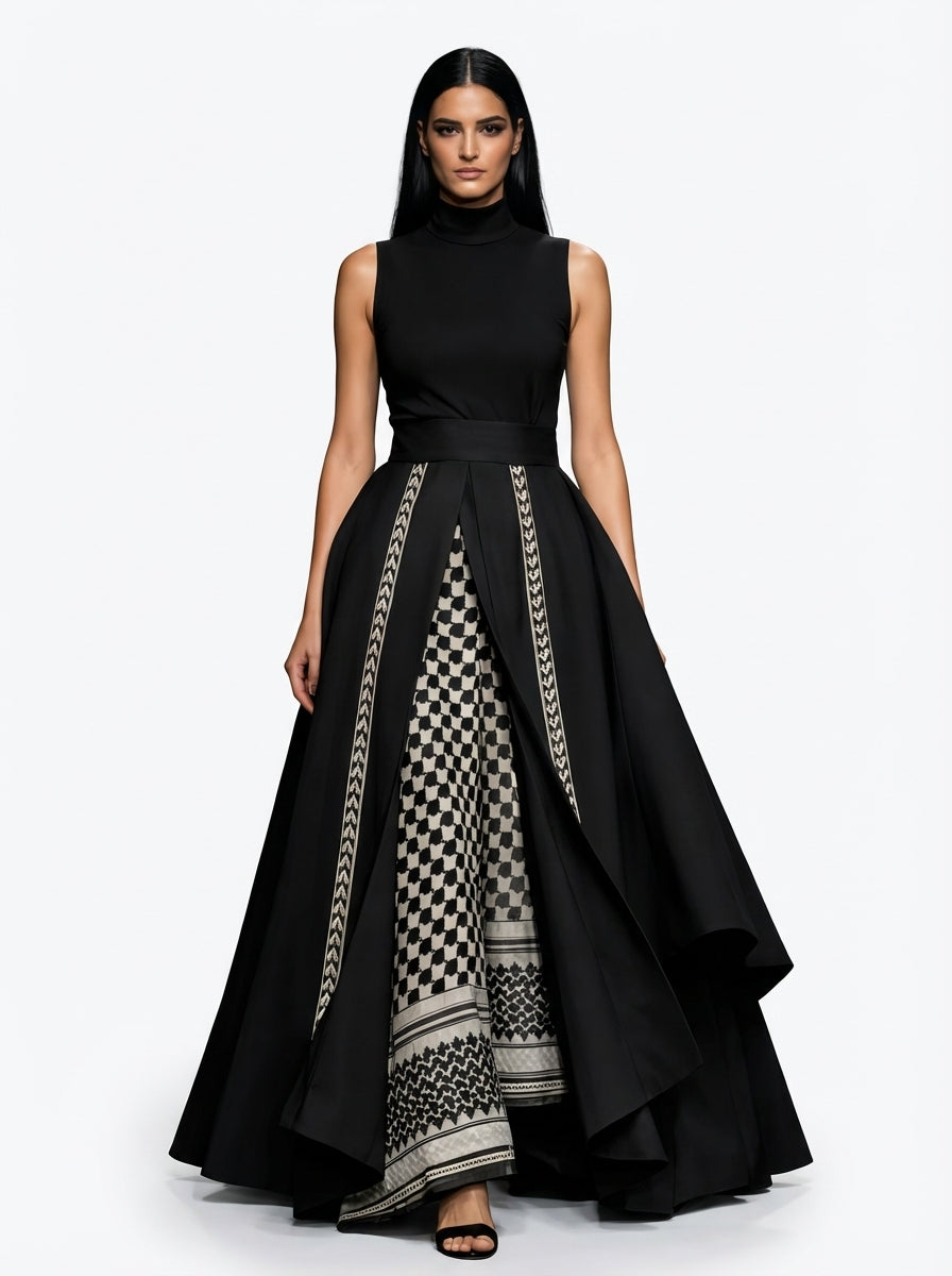 This skirt unfolds in deliberate layers of matte printed rosaline, revealing a concealed kufiya panel at its heart — a quiet truth held within strength.