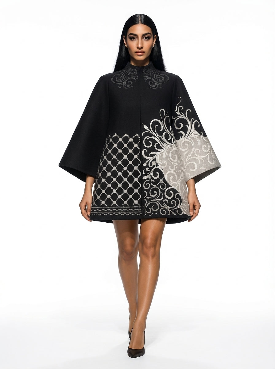 A sculptural mini cape in goukh fabric, cut with architectural restraint and softened by flowing arabesque embroidery. Kufiya geometry grounds one side in memory, while fluid motifs bloom across the other—discipline meeting intuition. The short length sharpens the silhouette, allowing the piece to hover between garment and gesture. It is not loud; it lingers.