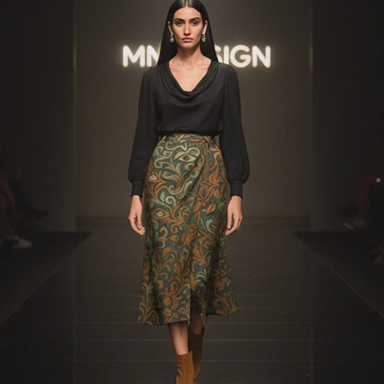 A poetic A-line midi skirt crafted from premium matte Rosaline, printed with swirling botanical arabesques that seem to breathe with life.
