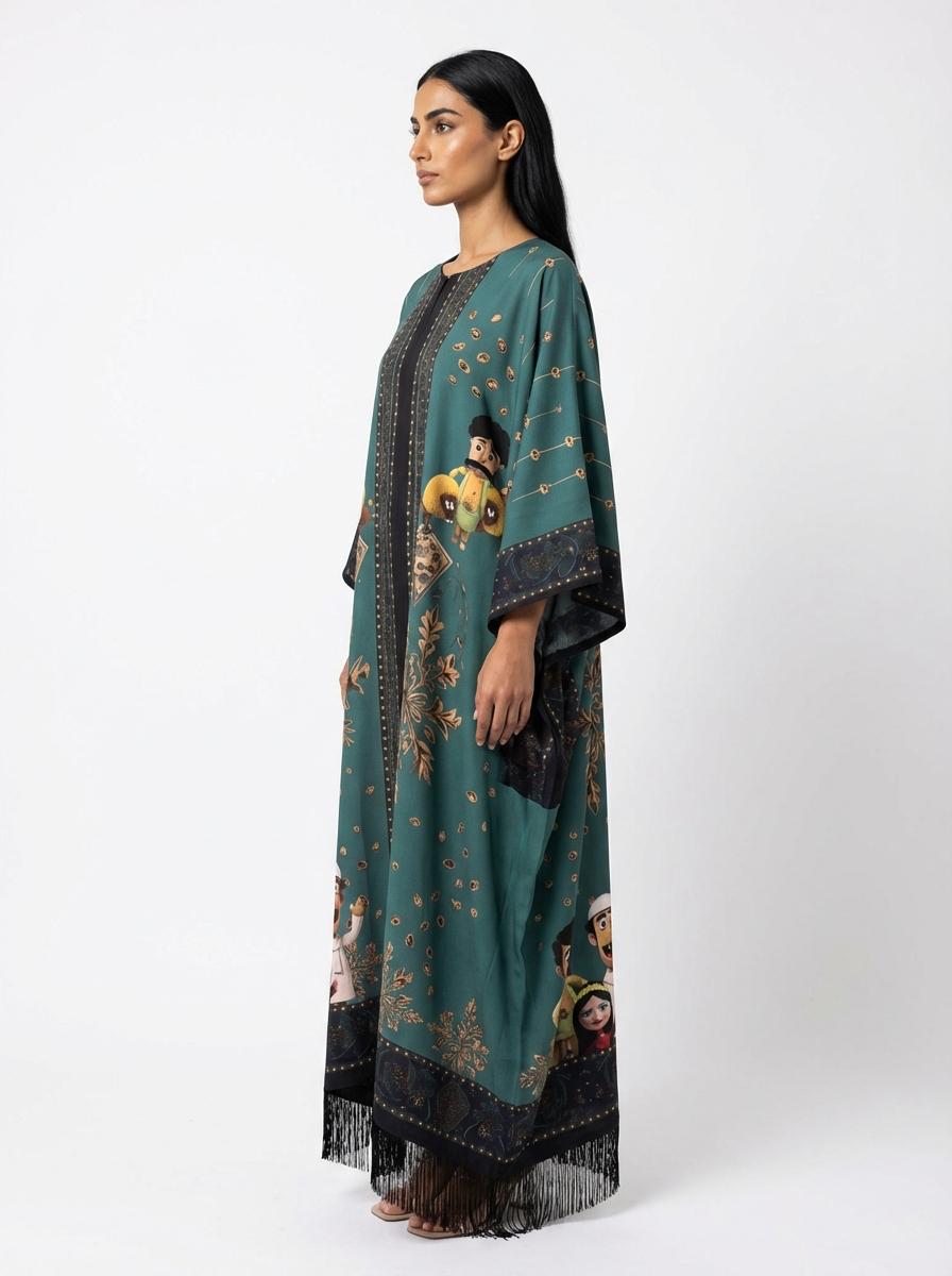 Crafted from printed Rosalin fabric, this zipper-front abaya blends structured elegance with festive illustration. The emerald-toned base is enriched with ornamental borders and heritage-inspired figures, creating a silhouette that feels both regal and nostalgic.