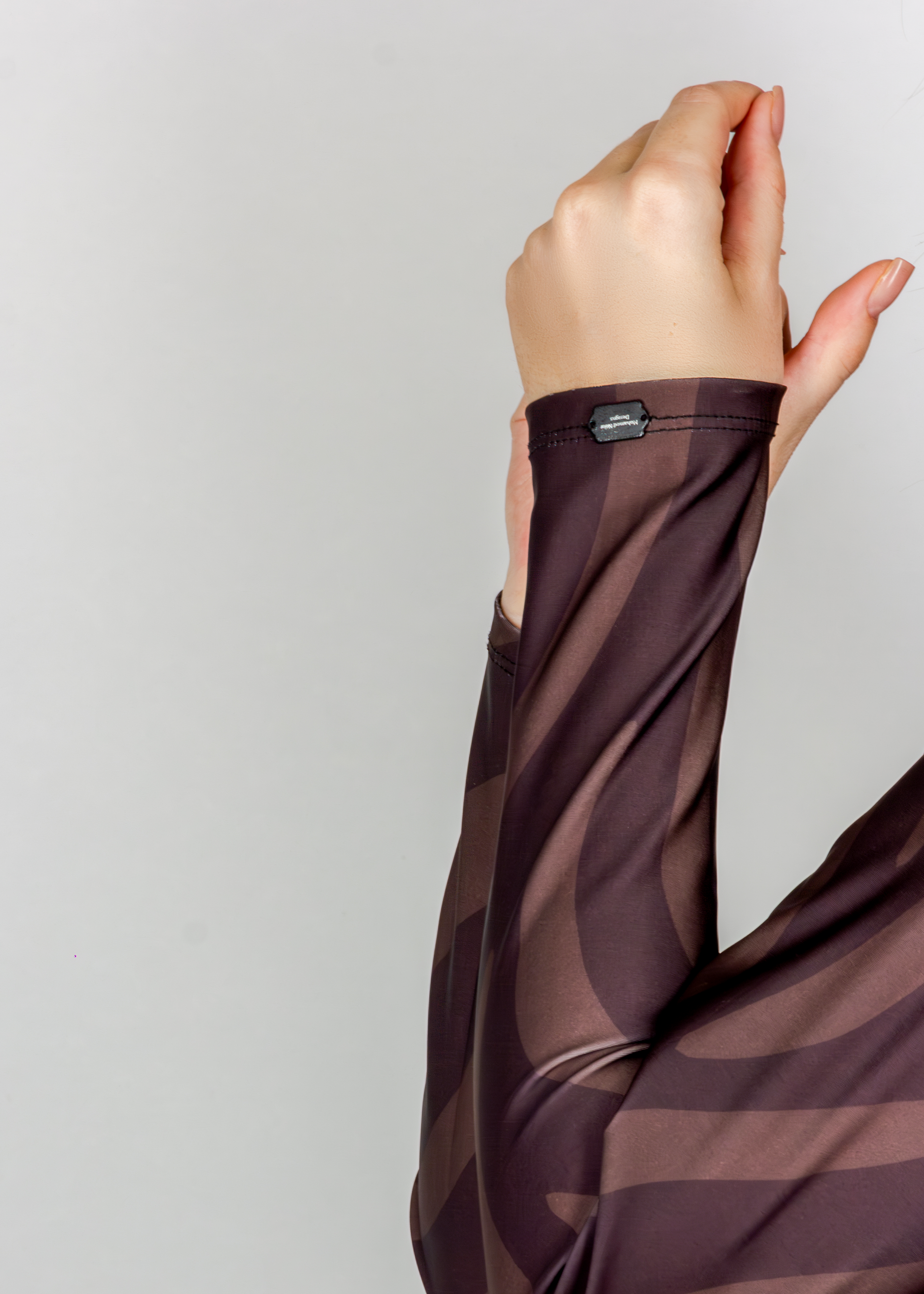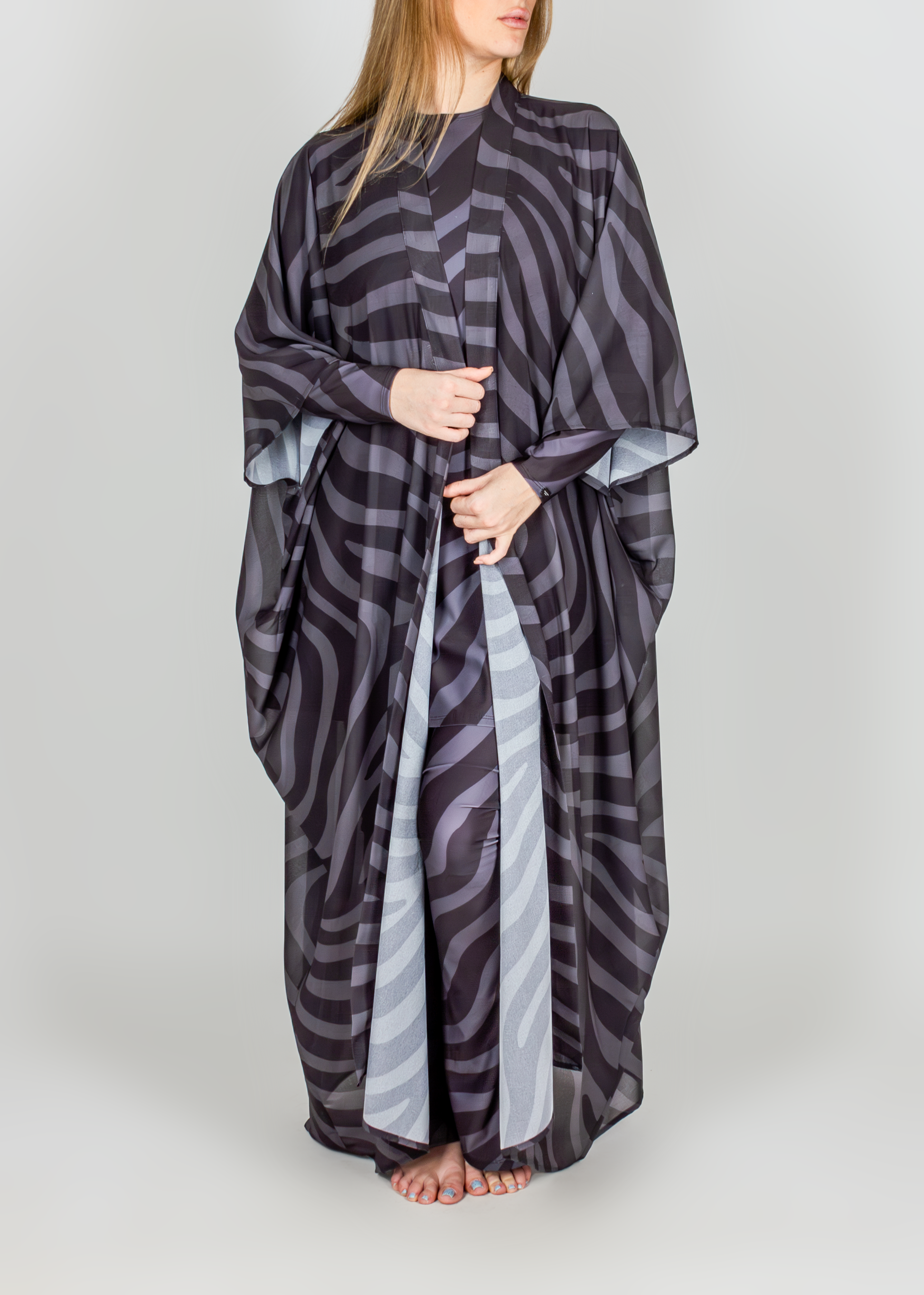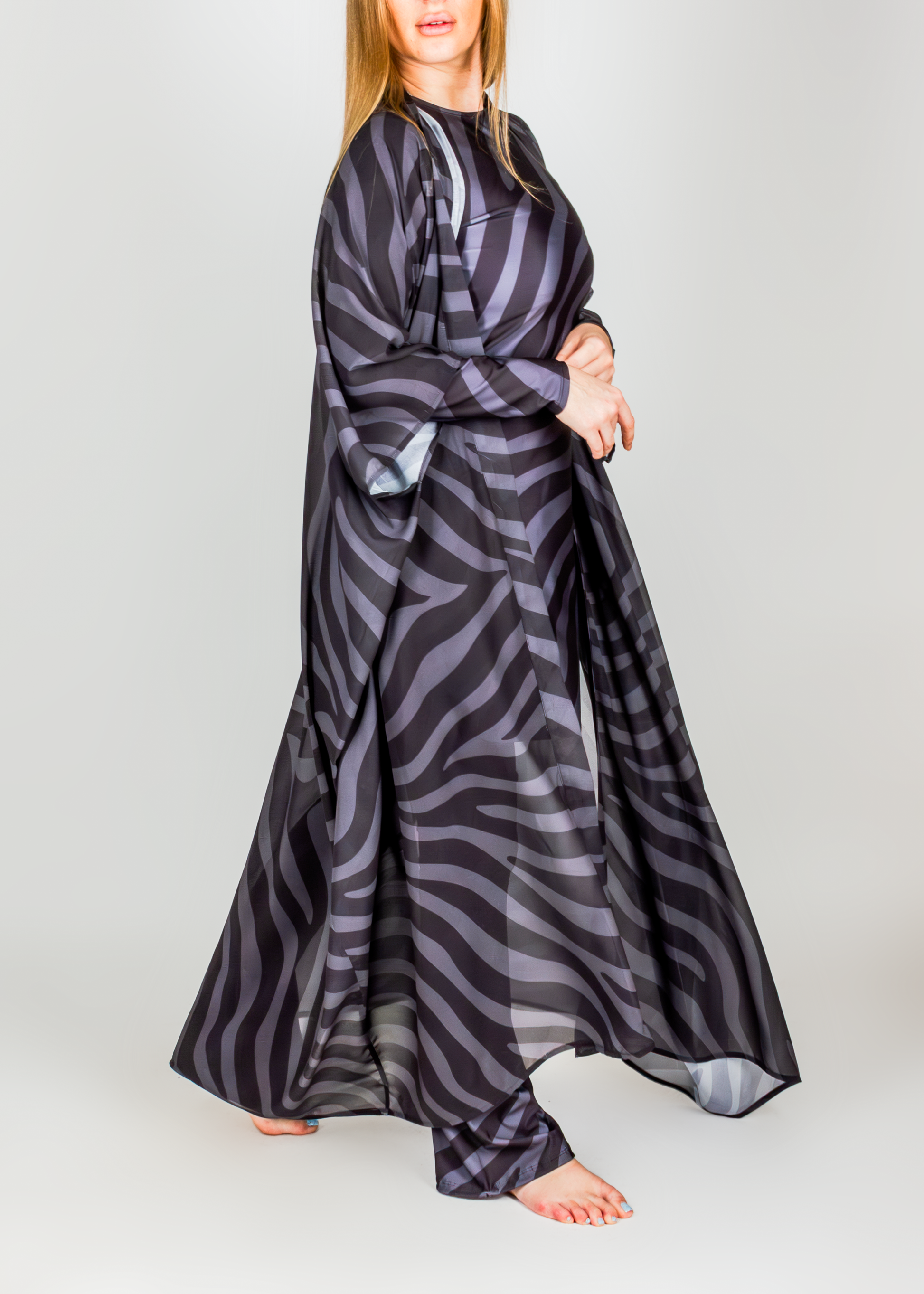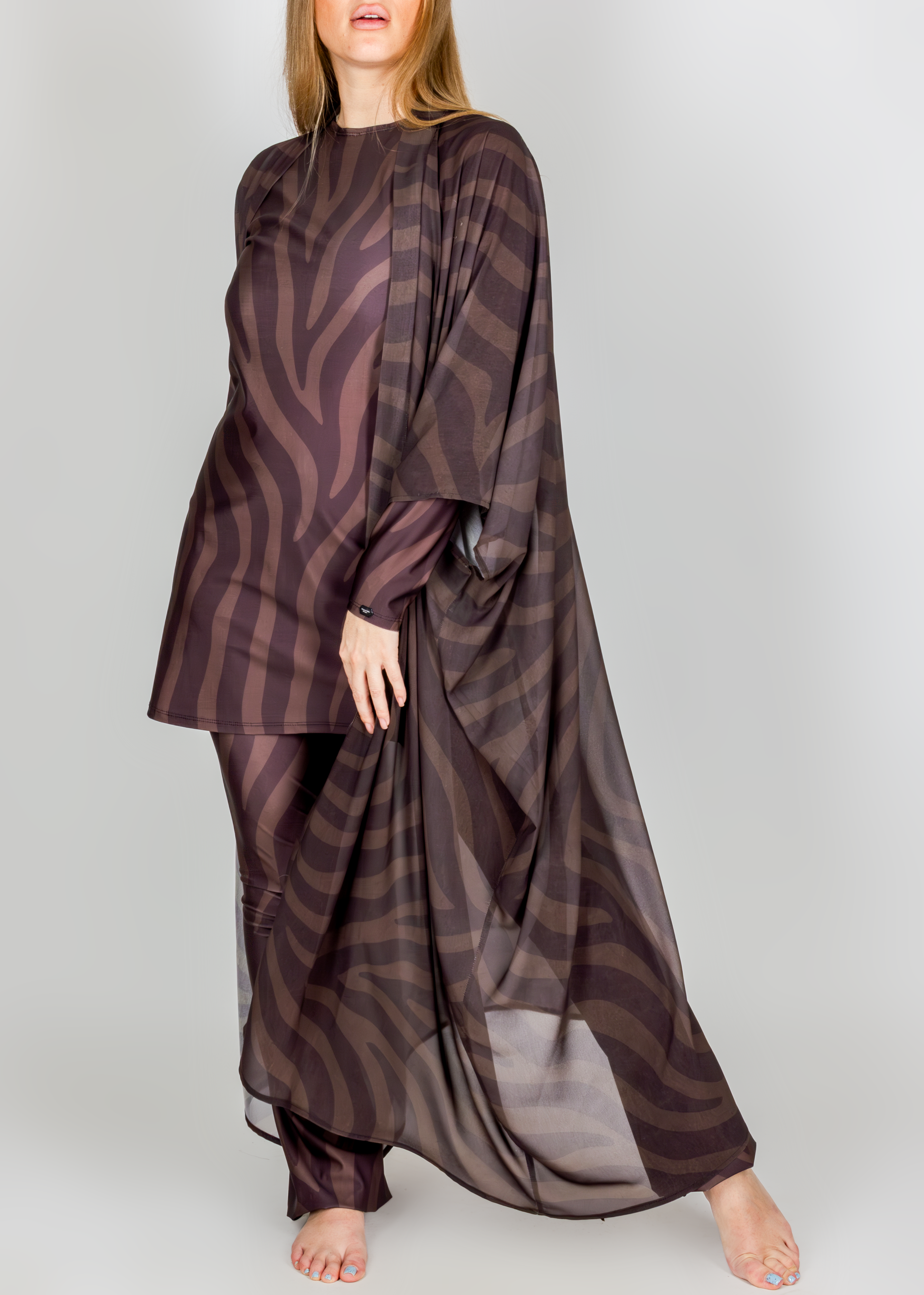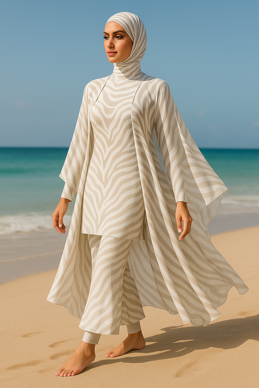 This elegant burkini flows with strength through its dynamic zebra-inspired print, blending form and freedom in every step. The sheer chiffon caftan cascades over a sculpted swim tunic and flared pants, reflecting motion, identity, and dignity.