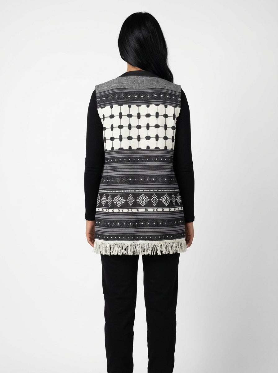 FATIMA25 Vest is part of our collection HORRA25, inspired by the Palestinian shawl pattern. Expertly crafted and designed by Mohamed Nour with meticulous attention to detail, this piece seamlessly blends traditional elegance with modern sophistication. Made from luxurious Gogh, it celebrates heritage and advocates for freedom and resistance, showcasing Mohamed Nour's artistic vision and cultural pride. All sketches are created using AI technology, while the final details of the pattern and sewing are guided by the designer's vision.