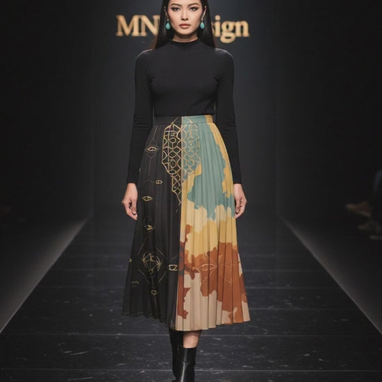 A pleated midi skirt crafted from matte Rosaline, printed in full with the legendary tale of Omna El-Ghola.