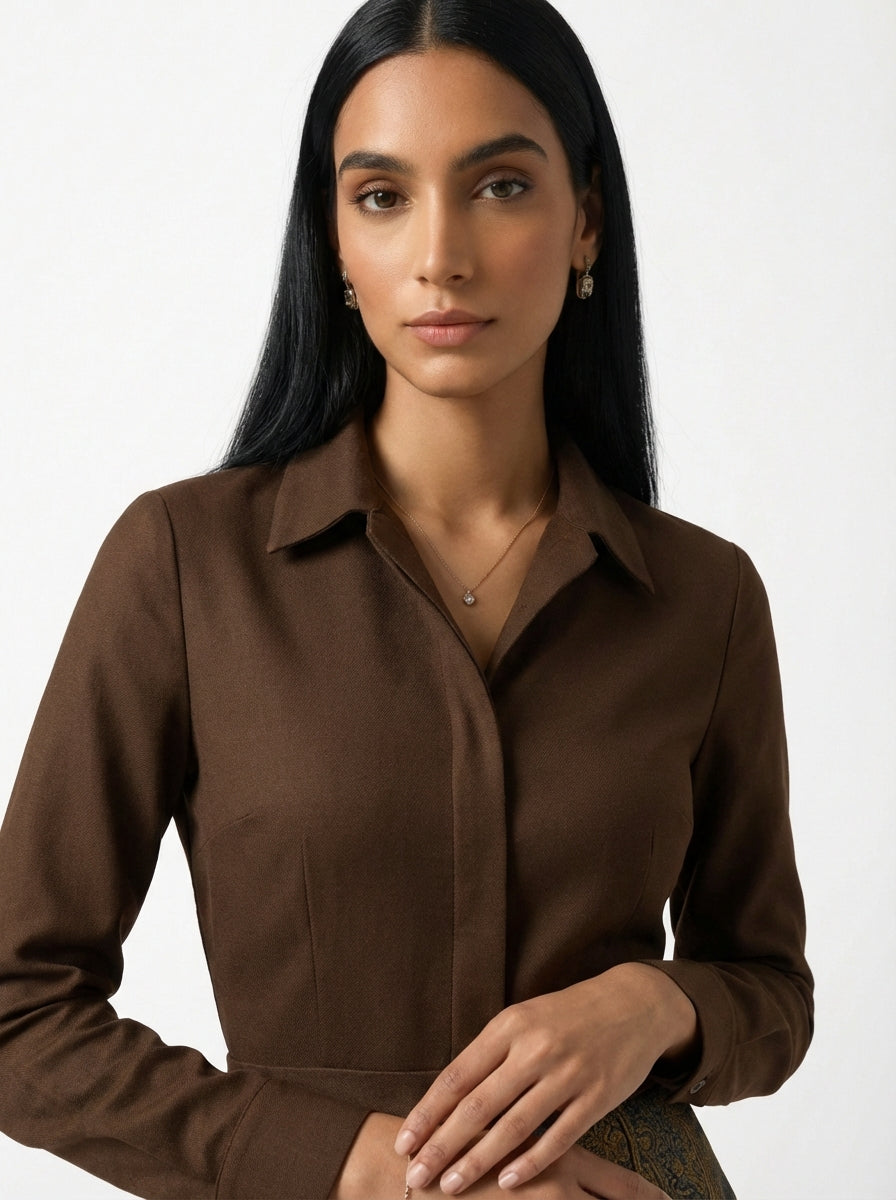 A structured, refined blouse crafted from luxurious matte satin, the "Shahrazad blouse" design reimagines a wardrobe classic with elevated tailoring. The sharp collar and clean front placket offer timeless poise, while princess darts contour the silhouette gracefully.