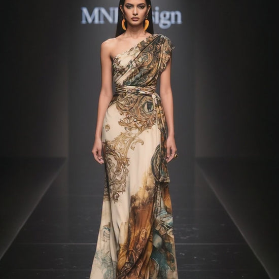 The silhouette is sculpted through asymmetric draping and a gathered waist sash that descends organically along the skirt, creating fluid movement with every step.