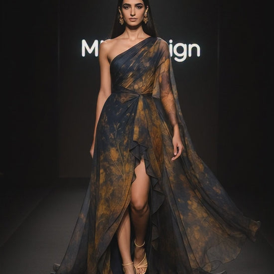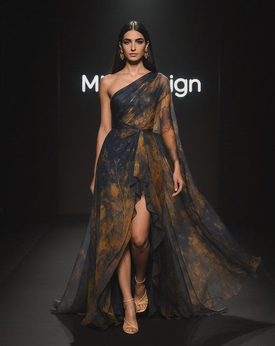 A celestial one-shoulder gown crafted from flowing layers of fine chiffon — light as dawn, mysterious as dusk.