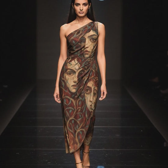 An asymmetric one-shoulder dress sculpted from matte Rosaline satin, where the artistry of myth meets modern tailoring.