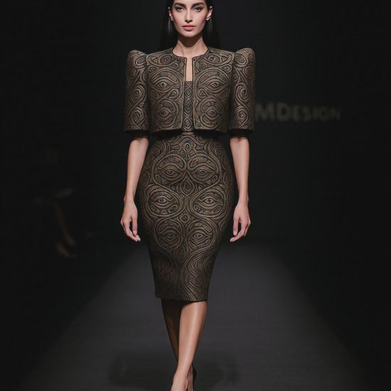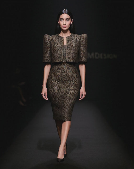 The cropped jacket, with its sculpted shoulders and geometric pattern, echoes the armor of a mythical guardian, while the bodycon dress beneath contours the body with quiet confidence.