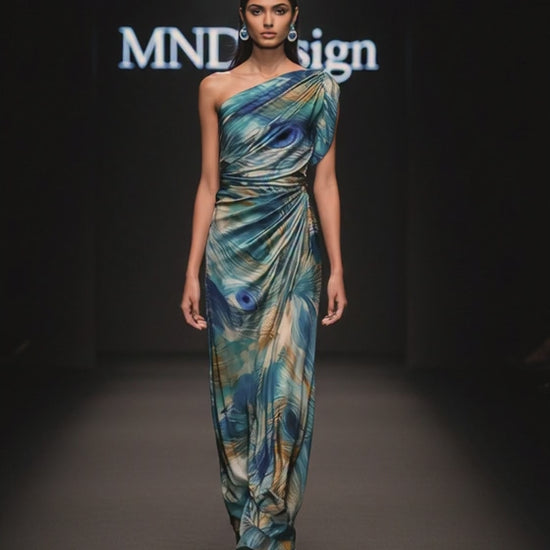 A breathtaking one-shoulder satin gown inspired by the mysticism of the peacock — a creature that embodies rebirth, pride, and celestial beauty.
