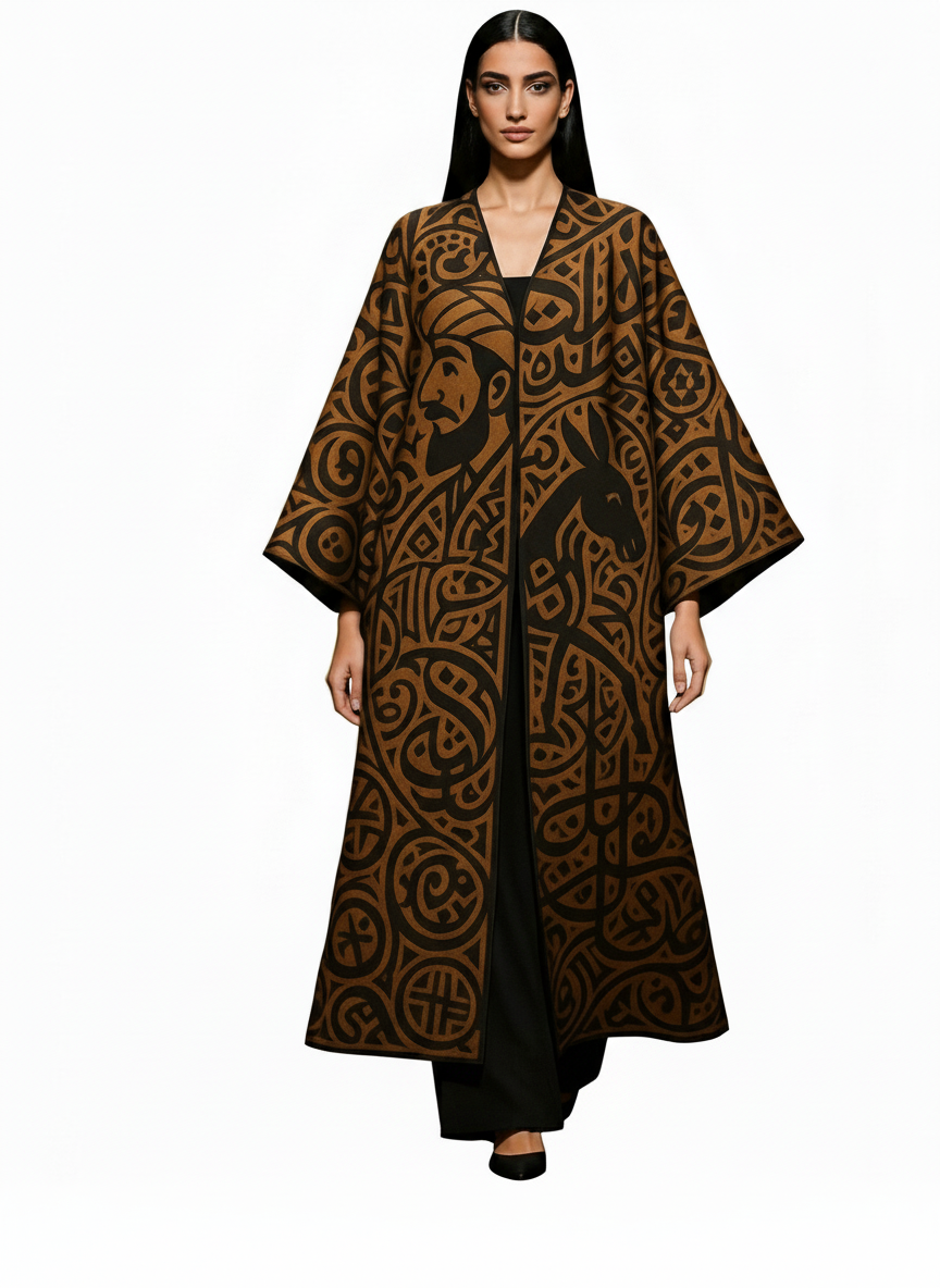 A narrative-rich kimono inspired by the timeless folk tale of Goha and his donkey. This piece captures the irony and wisdom of the classic story through intricate calligraphic swirls and bold, symbolic motifs. Crafted from luxurious Rosaline fabric, the silhouette drapes with authority and grace — transforming a humorous parable into wearable art.