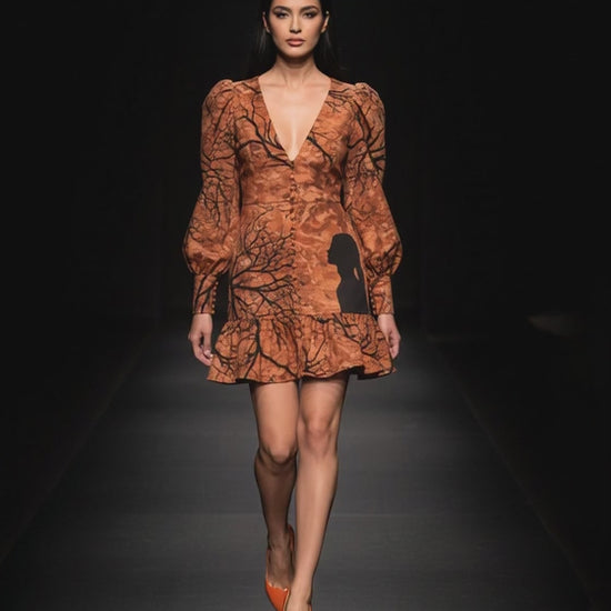 A fitted short dress crafted from matte Rosaline satin, designed with long puffed sleeves and a deep V neckline that merges sensuality with story.