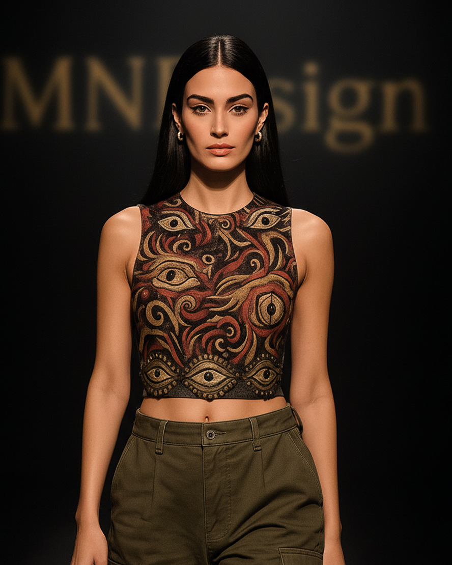 A sleeveless Rosaline cropped blouse that channels the mystic vigilance of Omna El-Ghola.