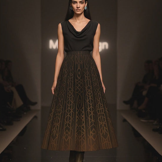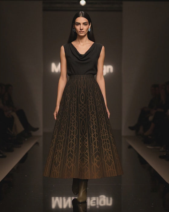An A-line midi skirt crafted from luxurious matte Rosaline, fully printed with a geometric lattice pattern inspired by the architectural mystique of ancient temples — where shadows form sacred symbols.